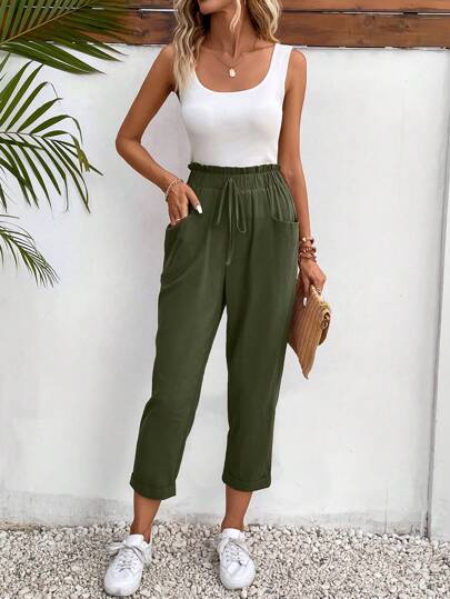 SHEIN Frenchy Solid Paperbag Waist Pants - Army Green - View 1