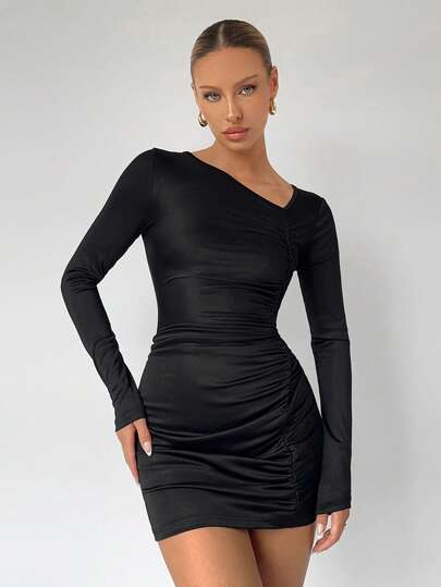 BizChic Solid Ruched Bodycon Dress Workwear - Black - View 1
