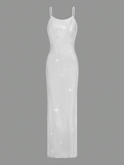 SHEIN Sweetina Solid Split Thigh Sheer Dress - White - View 1