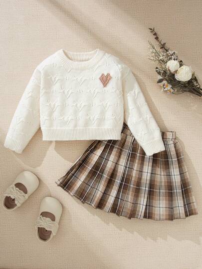 Souflis Souflis Baby Girl Casual Heart Pattern Sweater & Plaid Pleated Skirt Set, Autumn Baby Set Autumn Winter Season Baby Girl Sweaters Set Babygirl Skirt Sets Two Piece Winter Outfits For Toddler Girl Baby Girl Skirt Set - Khaki - View 1