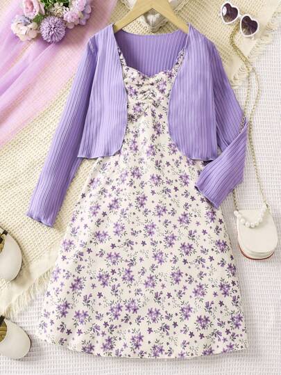 Sparklyn Tween Girl Ditsy Floral Print Ruched Front Cami Dress & Lettuce Trim Jacket Set - Purple - View 1
