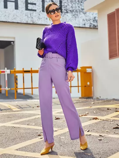 Split Hem Buckle Belted Straight Leg Pants - Lilac Purple - View 1