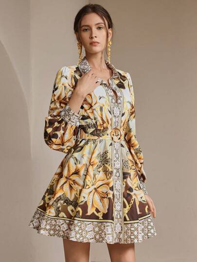 Anewsta Spring Festival Lantern Sleeve Floral Print Dress - Multicolor - View 1