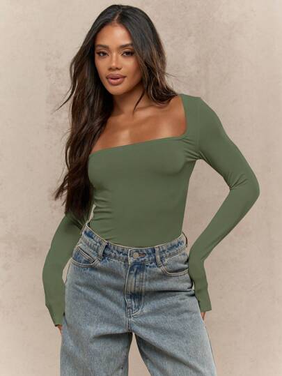 MISSGUIDED Sleek Square Neck Bodysuit Long Sleeve Form Fitting Basic Layering Essential Fall Winter Party Club Night Out Seamless Stretchy Fashion Top - Army Green - View 1
