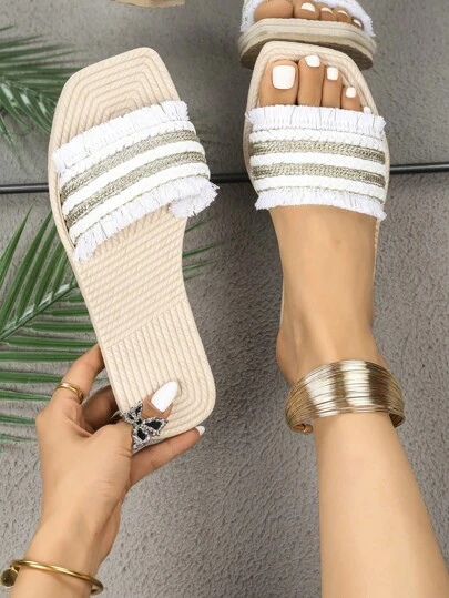 Square Toe Woven Summer Casual Flat Slippers - White - View 1