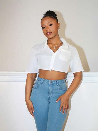 Steph T White Asymmetric Hem Cropped Shirt,Short Sleeve Tops - White - View 6