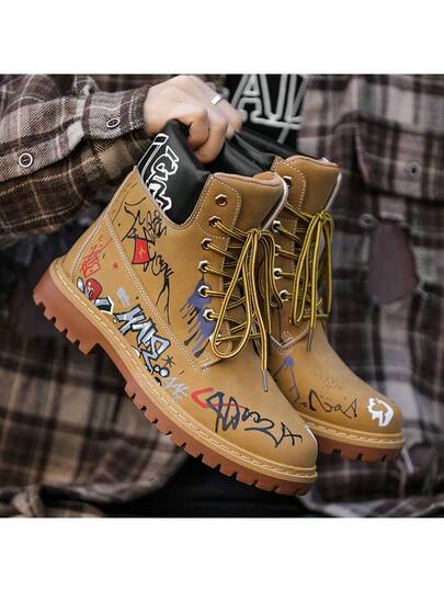 Street Graffiti Men's Retro High-Top Skate Shoes - Ultra-Comfortable Cushioning, Non-Slip, Casual Lace-Up Canvas Sports Shoes, Suitable For Active Men, Perfect For Outdoor Adventures And Leisure Activities - Yellow - View 1