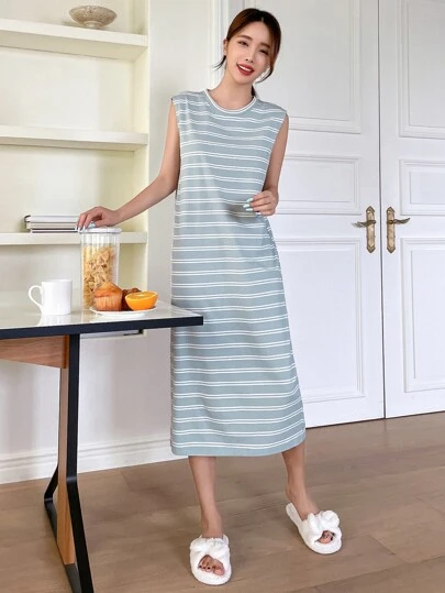 DAZY Striped Print Night Dress - Baby Blue - View 8