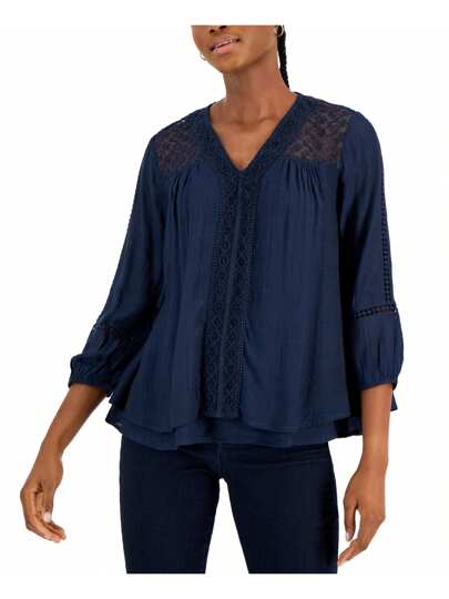 Style & Co Petite V Neck Lace Trim Top - Blue - View 1