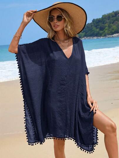 Swim Vcay Summer Beach Pom Pom Trim Batwing Sleeve Cover Up - Navy Blue - View 1