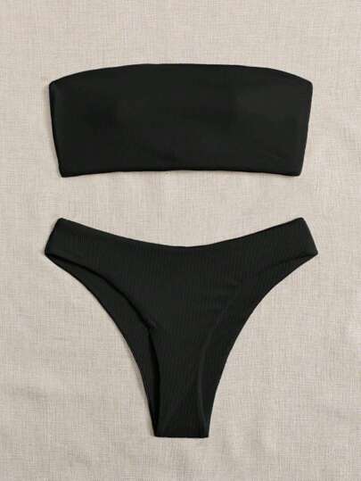 Swim Basics Summer Beach Ribbed Knit Bandeau Bikini Set - Black - View 1