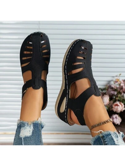 Summer Closure Toe Sandals Casual Shoes Sports Shoes Light Soft Bottom Mid Heel Wedge Sandals - Black - View 1