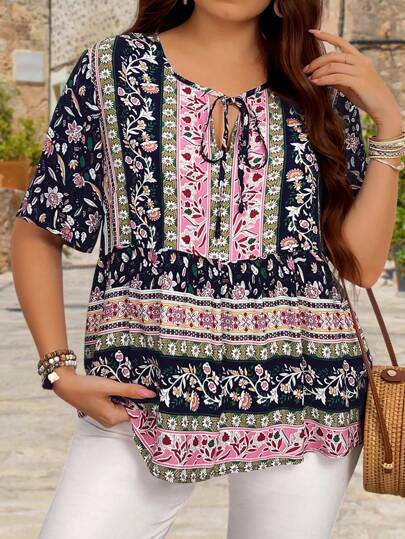 EMERY ROSE Summer Countryside Floral Plus Size Blouse,Flower/Vacation/Spring - Multicolor - View 1