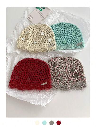 Summer Hollow Out Knitted Hat Women Retro Versatile Handmade Crochet Beanie Thin Sunscreen Beanies, Spring/Summer Slouchy Hats, Macaron Colors, Fashionable Y2K Sparkle Knit Cap For Party Autumn/Winter Hollow Out Knitted Hat Women Retro Versatile Handmade Crochet Beanie Thin Sunscreen Beanies, Slouchy Hats, Macaron Colors - Round Bright Wire - View 1