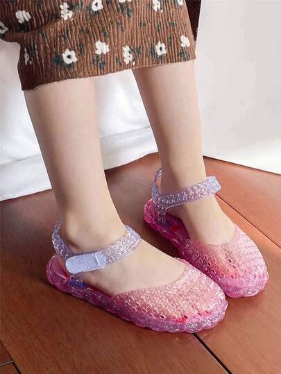 Summer Kids Jelly Sandals Closed Toe Hollow Shoes Colorblock Girls Crystal Princess Shoes, Versatile Casual Beach Shoes - Hot Pink - View 1