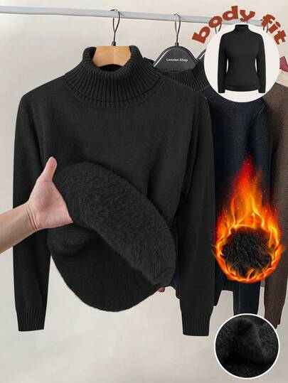 Calvaya Plus Size Women's Solid Color Black Turtleneck Long Sleeve Sweater, Winter Knit Pullover Fall Autumn - Black - View 3