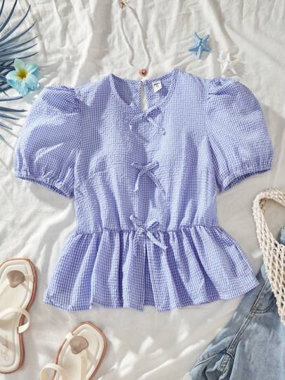 Sweet Cute Plaid A-Line Short Sleeve Blouse, Casual Holiday Wear, Summer Girl Bowknot Clothing - Blue - View 1