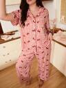 SweetSlumber Contrast Color Fair Isle Heart Print Lapel Long Sleeve Women Pajama Set