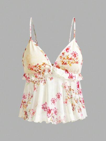 Sweetina Spaghetti Strap Printed Mesh Tank Top, Fashionable For Summer - Apricot - View 1