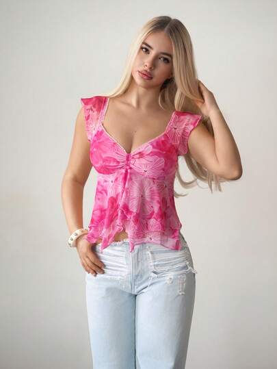 Sweetina Women's Pink Floral Print Ruffle Hem Vacation Casual Camisole Top - Red - View 1