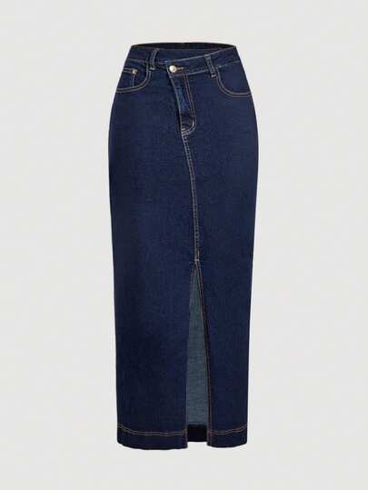 Sweetra Fashionable Casual Elegant Asymmetric Waist Slit Denim Skirt - Dark Wash - View 1