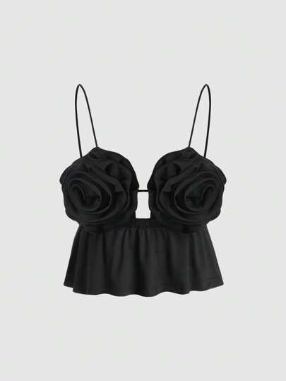 Sweetra Ladies' Hollow Out Front Tank Top With 3d Flower Decor Y2K  - Black - View 1