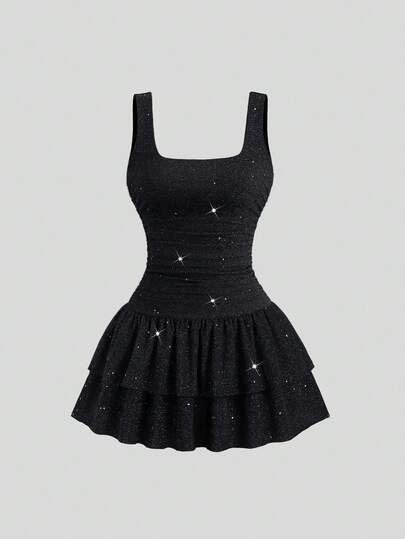 Sweetra New Autumn/Winter Fitted Shiny Party Cake Hem Mini Dress For Women - Black - View 1