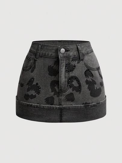 Sweetra Women's Fashionable Washed Rhinestone Embellished Fitted Mini Denim Skirt, Summer - Grey - View 1