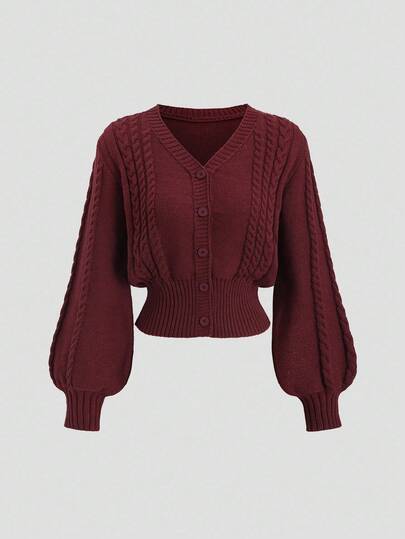 Sweetra Women's Loose Fit Lantern Sleeve V-Neck Cardigan Sweater, Minimalist & Sweet, Burgundy, Autumn/Winter Fall Cloth For Women - Burgundy - View 1