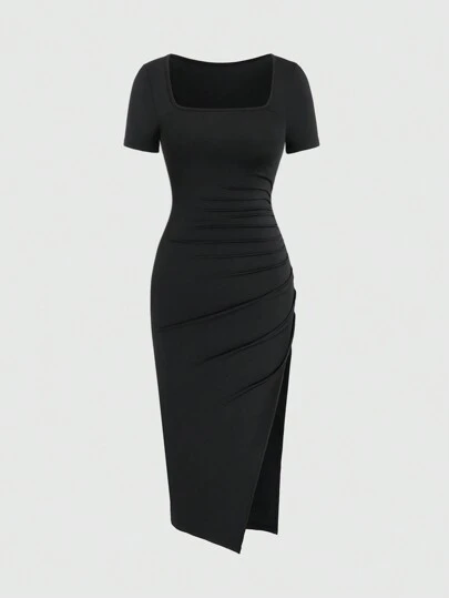 Sweetra Women's Summer Plain Square Neck Short Sleeve Slim Fit Elegant Dress With Pleats, Side Slit And Asymmetric Hem Maxi Women Outfit - Black - View 1