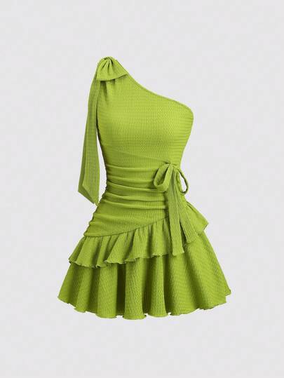 Sweetra Y2K Sexy Asymmetrical Shoulder Vacation Textured Pleated Chiffon Dress - Green - View 1
