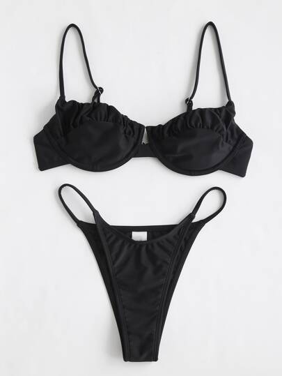 Swim Basics Summer Beach Ruched Bikini Set Push Up Bra & Thong Bottom 2 Piece Bathing Suit - Black - View 1