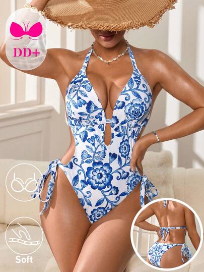 Swim DD+ 26SS Women's Spring/Summer Beach Outfit, One-Piece, Sexy & Elegant Boho Bohemian Floral Print In Blue & White, Adjustable Tie, Suitable For DD+ Bust Size - Blue and White - View 1