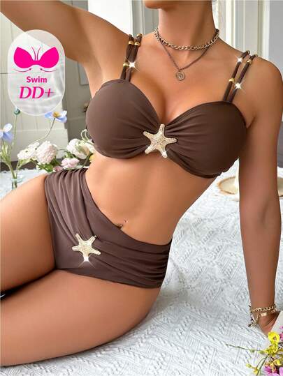 Swim DD+ DD+ Size Rhinestone Decor High Waisted Bikini Set, Wireless For Summer Beach Vacation - Brown - View 1
