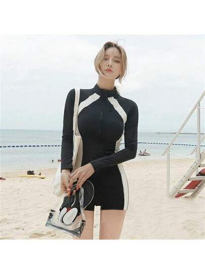 Swim Gear Sets - Black and White Striped Long Sleeve Jumpsuit - View 1