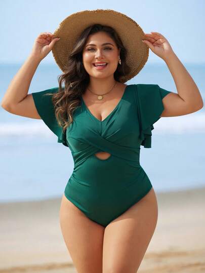 Swim Lushoire Plus Size Solid Color Ruffle Trim One-Piece Swimsuit Summer - Dark Green - View 1