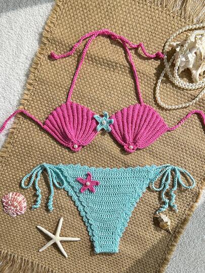 Swim Mod 2pcs/Set Spring/Summer Crochet Starfish & Shell Pattern Design Spaghetti Strap Backless Beach Cover Up Set For Women - Purple - View 1