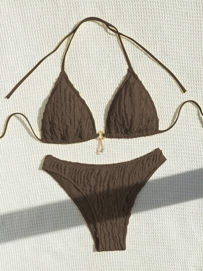 Swim Mod 2pcs/Set Women Summer Beach Solid Color Halter Tie Sexy Bikini Swimwear - Coffee Brown - View 1