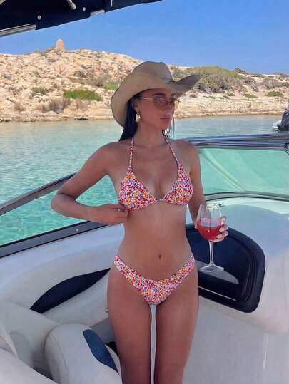 Costavie Women Summer Beach Ditsy Floral Printed Halter Neck Vacation Bikini Set, Random Print - Multicolor - View 1