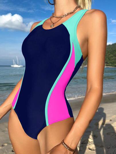 Swim SPRTY Summer Beach Women Fashion Color-Block Sleeveless One Piece Swimsuit - Multicolor - View 1