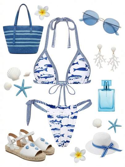 Swim Vcay Women's New Fish Print Striped Trim V-Neck Halter Backless Triangle Top And Bikini Bottom Two Pieces Swimsuit, Spring/Summer - Multicolor - View 1