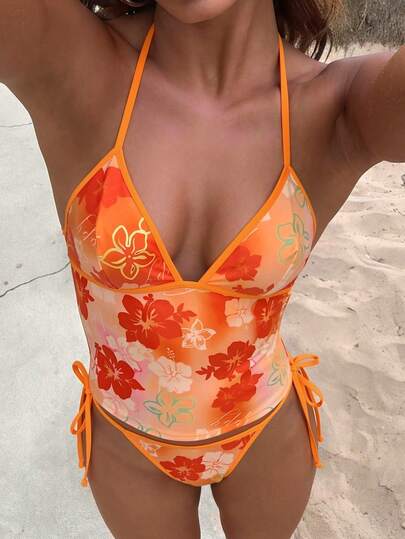 Swim Vcay Women's Summer Beach Floral Print Halter Tie Top And Triangle Bikini Bottom Swimsuit Set - Pink - View 1