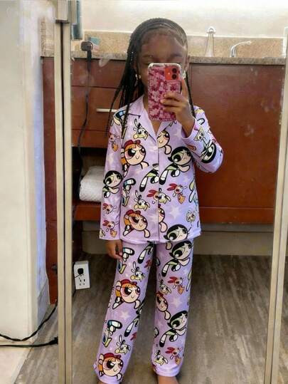 THE POWERPUFF GIRLS X SHEIN 2pcs Tween Girl Cute Cartoon Blossom, Bubbles, Buttercup Pattern Button Front Top And Straight Leg Loose Fit Pants Pajama Set Power Puffs Girls Pajamas Tween Girl Power Puff Pjs Powerpuff Girls Sleepwear Girls Pajamas Cartoon Pajamas - Purple - View 1