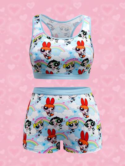 THE POWERPUFF GIRLS X SHEIN Plus Size Cute Cartoon Pattern Racer Back Bra And Panty Set - Blue - View 1