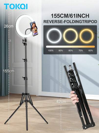 TOKQI 155cm/61.02in LED Light, 26cm/10in Rotating Ring Light With Flexible Phone Holder, 3 Color Temperatures, 10 Brightness Levels, Extendable Tripod, Suitable For Live Streaming, Photography, Video Recording, Makeup, Selfie, Compatible With Smartphones - Ring Fill Light + Stand Set - View 1