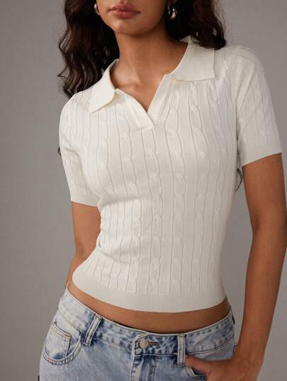 TRNVIE Casual Solid Color Polo Neck Short Sleeve Twist Knit Sweater - White - View 1