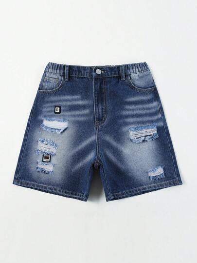 Teen Boy Ripped Distressed Washed Denim Shorts With Letter & Patch Detail - Medium Wash - View 1