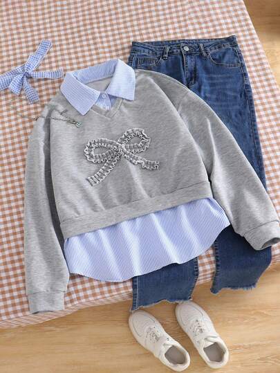 Teen Girl Casual Pullover Sweatshirt, Versatile For School & Commute, 2 In 1 Sweatshirt With Shirt Collar, Numeric & Letter, Leopard Print Pattern, Loose Fit - Grey - View 3