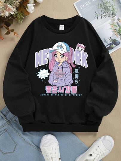 Teen Girl Figure & Letter Graphic Drop Shoulder Sweatshirt - Black - View 1