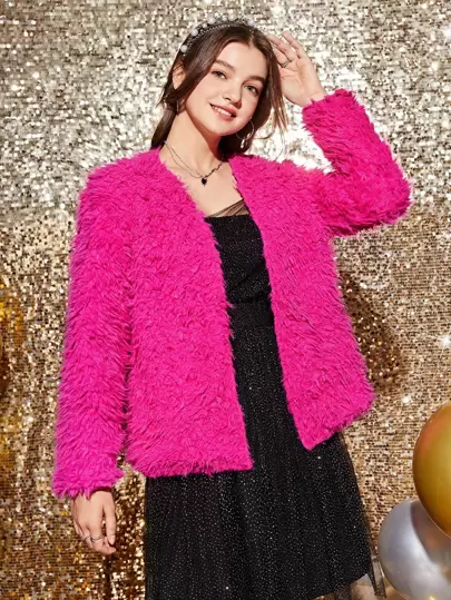 Teen Girl Open Front Fuzzy Coat - Hot Pink - View 1